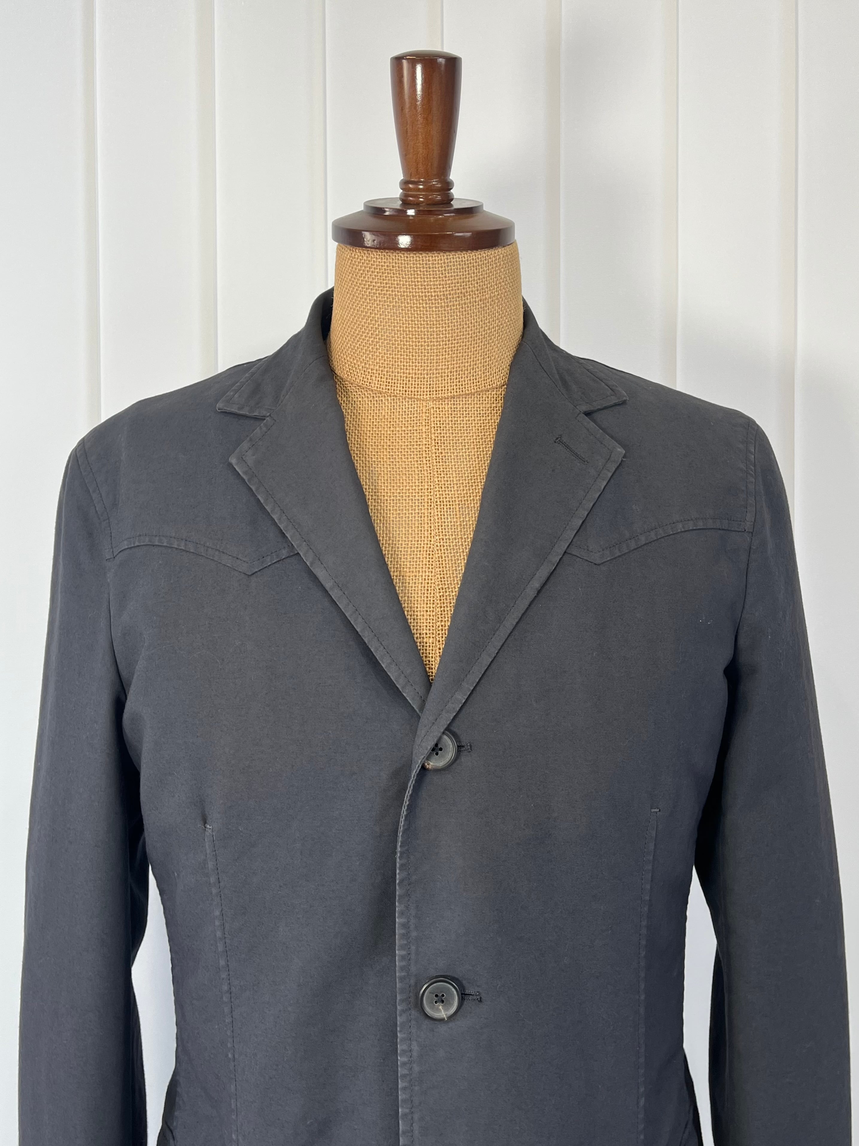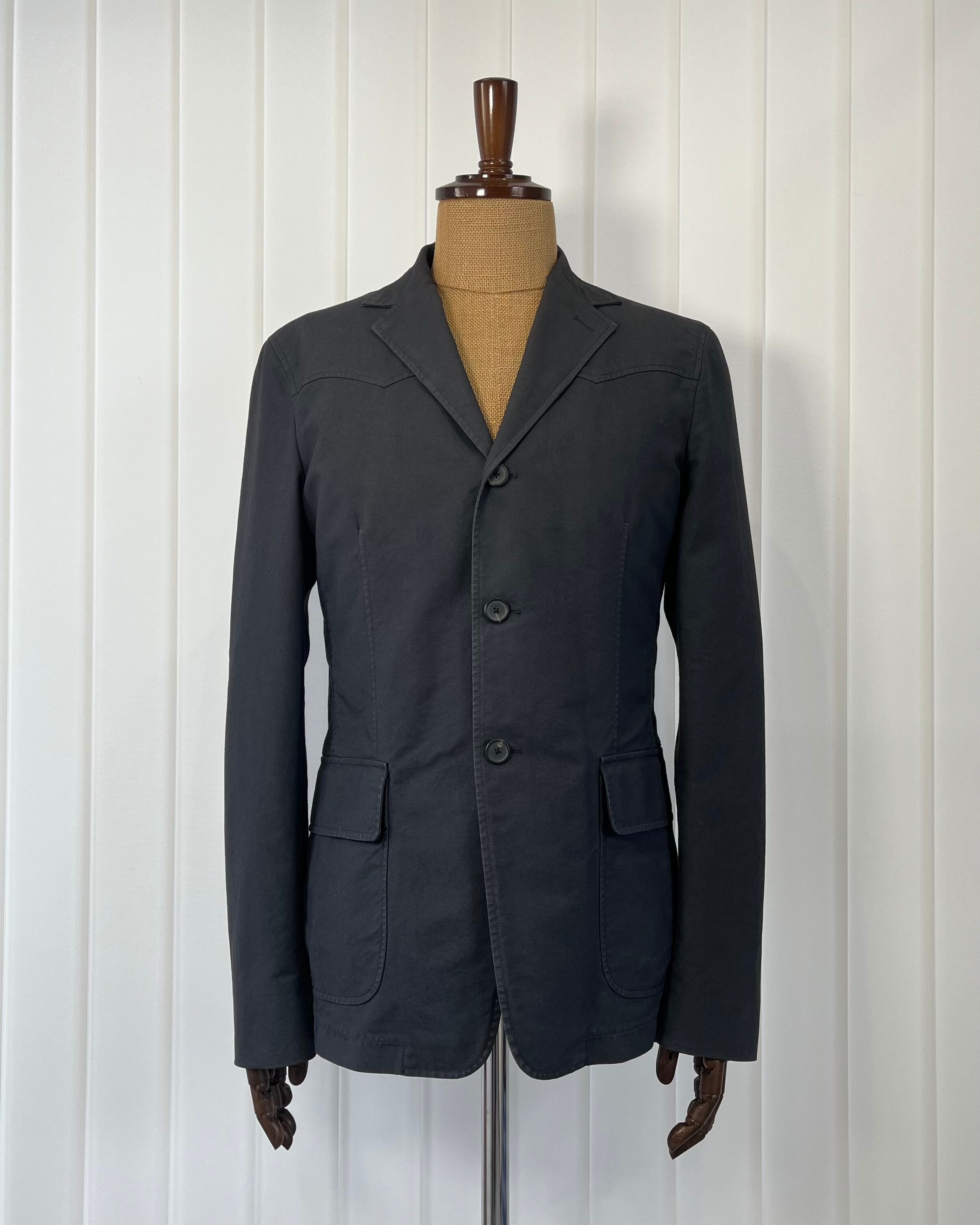 一見ミニマルな3ボタンテーラードの構成ながら、胸から背面にかけて施されたウエスタンシャツを想起させるヨーク切り替えが特徴的な一着です。ブランドが得意とするクリーンなテーラリングの文脈に、アメリカーナ的な要素を静かに差し込んだデザインは当時のラフ・シモンズの関心領域をよく示しています。
